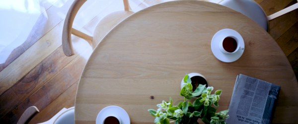 少しだけ反りあがった天板の縁のデザインは、 シャープな印象を与えてくれるだけではなく、飲み物をこぼした際など、テーブルに置くものを優しく受け止めてくれる細やかな機能性も嬉しいPointです。