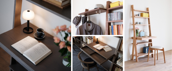 本を読んだり、パソコン作業をしたり、ドレッサーのように使用したりと、間取りや用途に合わせて約6アイテム(サイズ違いも含む)のキャビネットを自由に組み合わせることで、機能的かつ軽快な壁面収納を楽しんでいただけます。